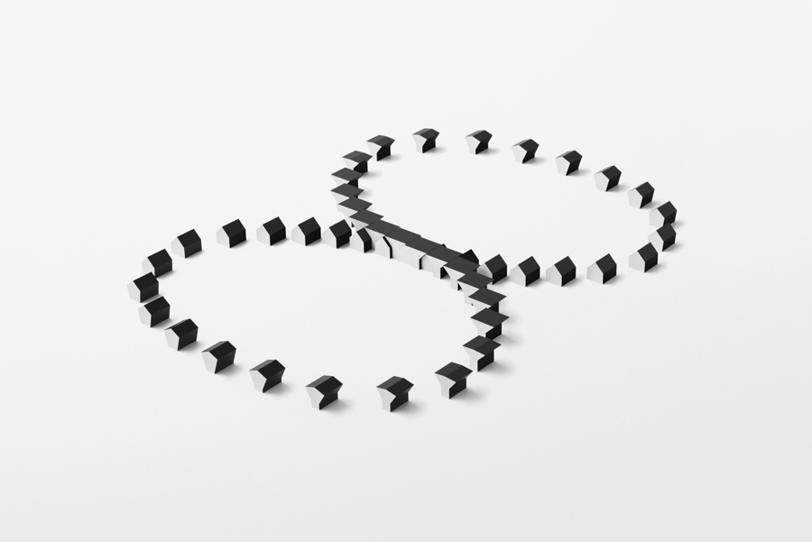 A long white bench placed in the middle of a seemingly modest gallery space allows visitors to linger in front of the detailed prints. To express the idea of Escher’s formative years and the process of finding his style as an artist, knee-high house shapes gradually emerge out of the rectangular bench. In a closer look it becomes apparent that on one side of the bench the houses are sliding out, while on the other side, the negative shapes of the house are shifting outwards and by so revealing the houses left behind. Both sides of the bench as well as its front and back are inverted and mirrored to fully render the concept of Escher’s early career.