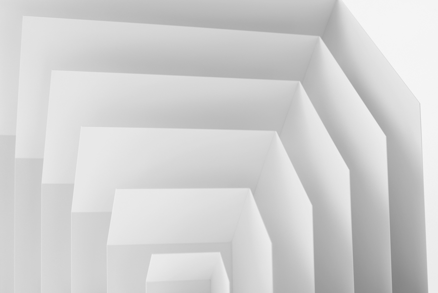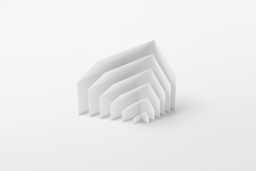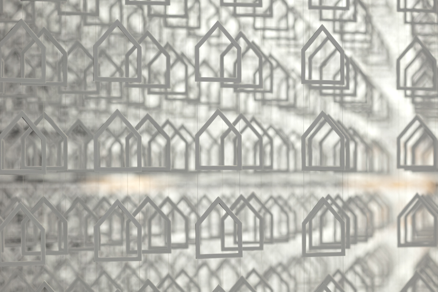 Made of more than 55,000 small flat black and white houses, the chandelier reveals in its centre a floating large shadow-like house, which is made from a change in the colour of the houses.