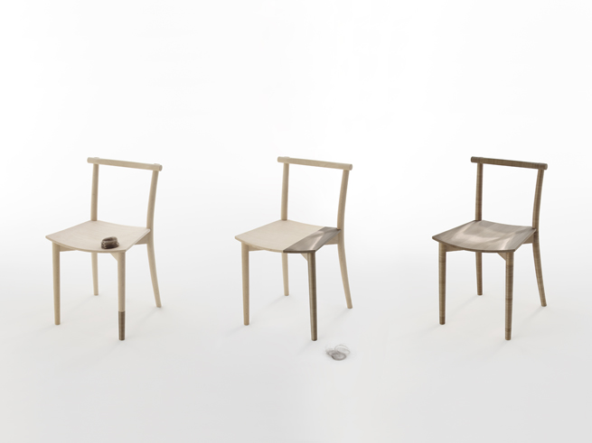 We wound fishing line tightly around all the surfaces of a wooden chair to give it a new luster and fine unevenness. The fishing line was dyed before use, allowing it to function like a kind of varnish, bringing the wood grain to life while adding color. The fishline chair is an exploration into ways of finishing wooden surfaces that go beyond the usual applications.