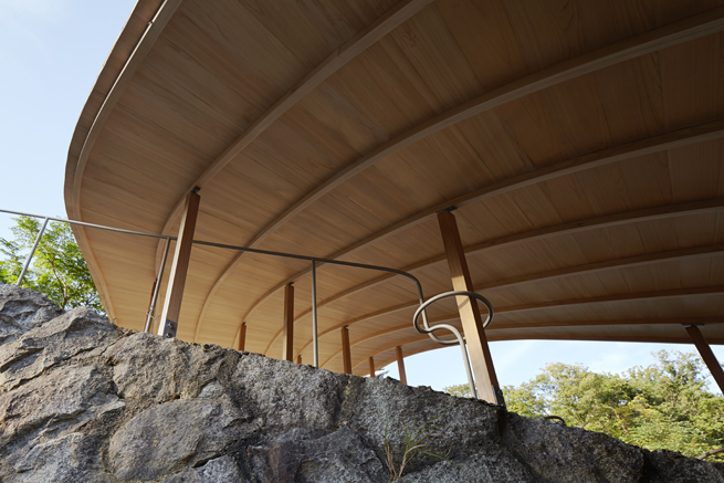 Nishizawa used a single roof to incorporate these elements into the pavilion’s design. The roof is subtly inclined to follow the angle of the site. Dipping under it, visitors realise that the roof, delightfully and ambiguously, is also a wall. The pavilion’s spatial experience is intended to remind visitors of walking in the mountains under thick tree cover. To date, many of Nishizawa’s buildings have felt like bright, open and airy fields or gardens, and the furniture inside them like wildflowers that blur the boundary between interior and exterior space while adding brightness and color. But for the shady interior of this wooden structure, clinging onto the hillside exposed to the elements, we thought that furniture like fungi would be much more appropriate. Our mushroom-like stools for the space were handmade by artisans to slightly different shapes and sizes, giving a more natural effect. The stools’ layout – clustered at the base of pillars, or in the nooks and crannies by stone walls and staircases – evokes the way that mushrooms grow in the wild, and details like a handrail that transforms into a mushroom continue the metaphor. We wanted to design architectural elements that would ‘grow’ naturally from the space, rather than to put furniture in a room.
