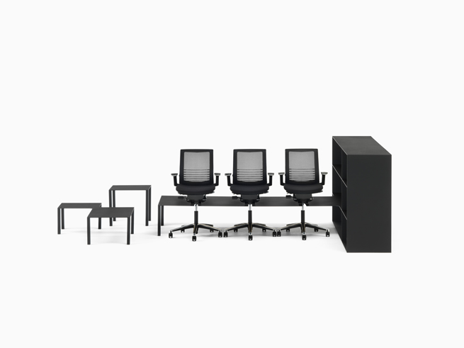 Resting and waiting functions appear when office chairs are partially absorbed into the shelf. A consideration of the boundary between ‘on-‘ (office) and ‘off-duty’ (lobby and amenity) furniture.