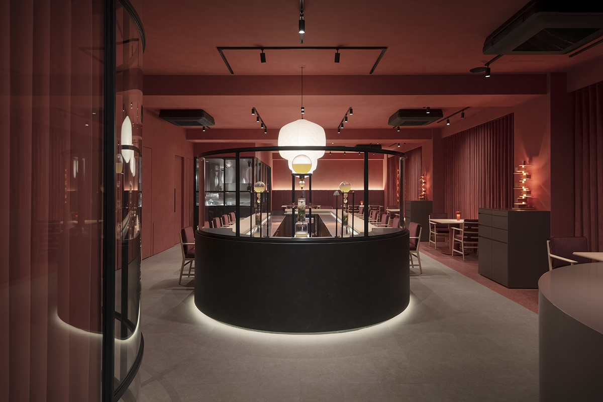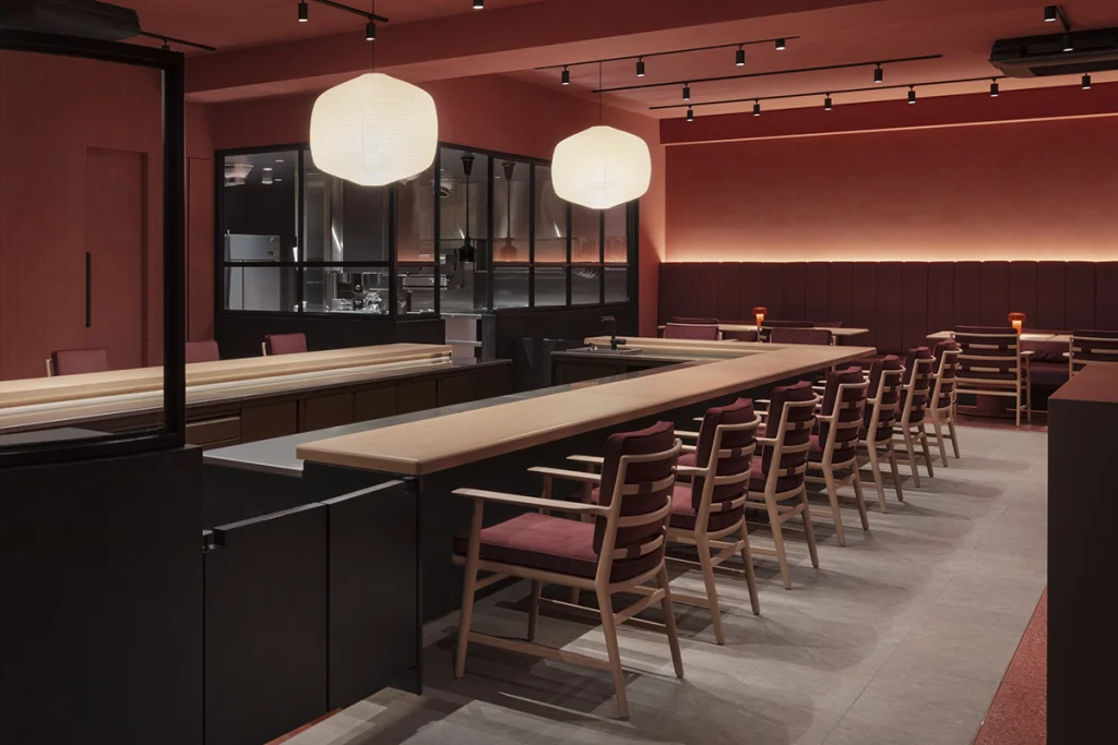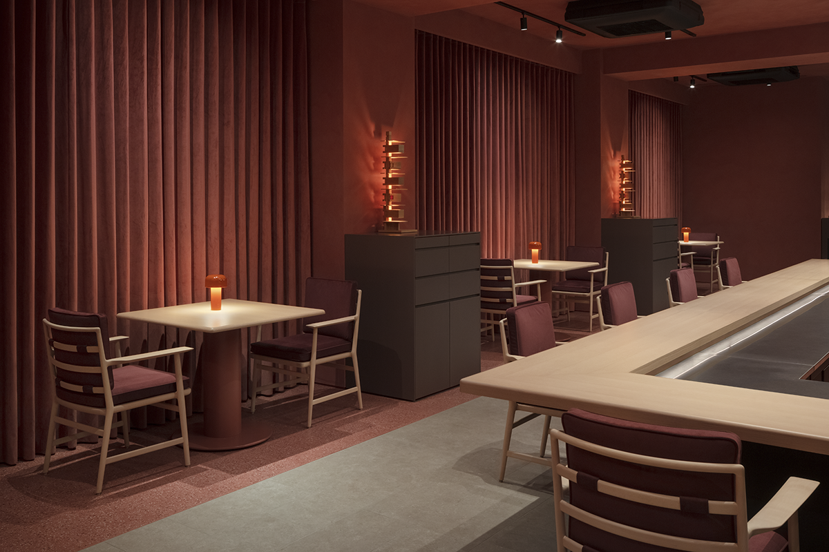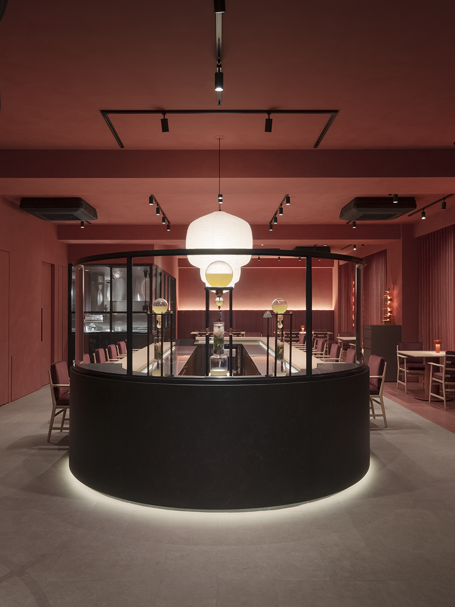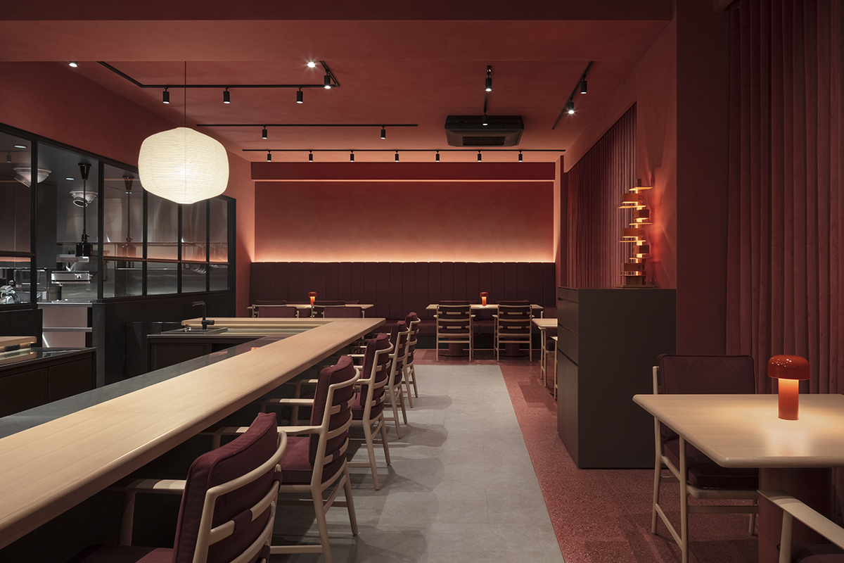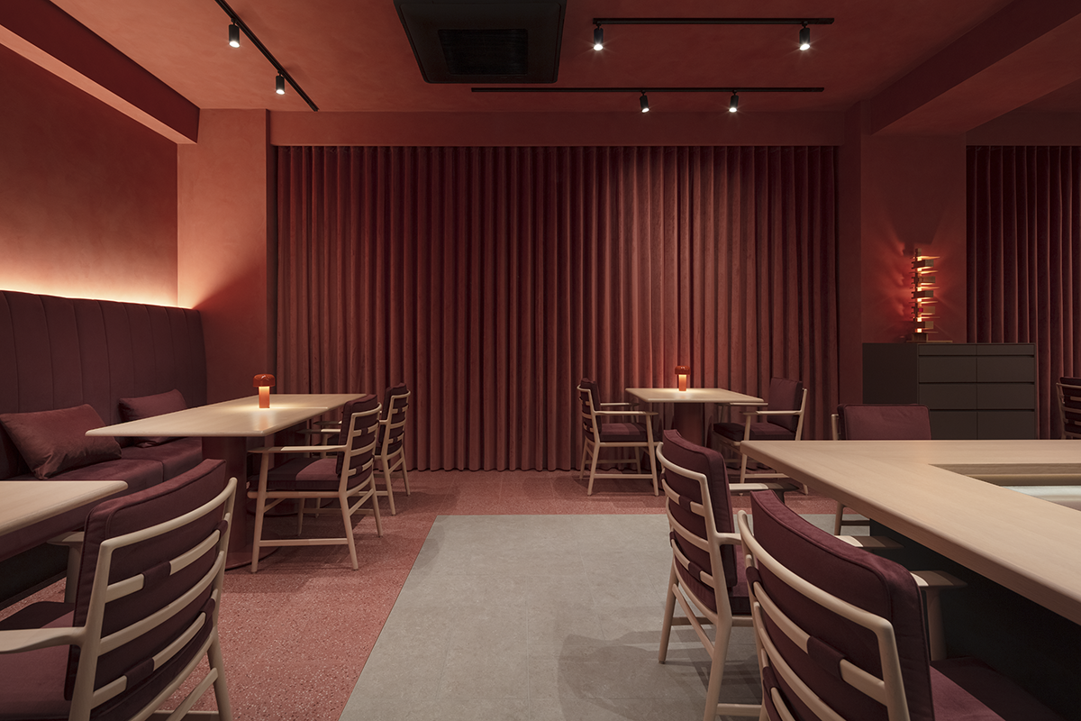 空間はピンクを基調としつつボルドーやブラウンで落ち着きを持たせ、水引のようなタッセルや提灯、