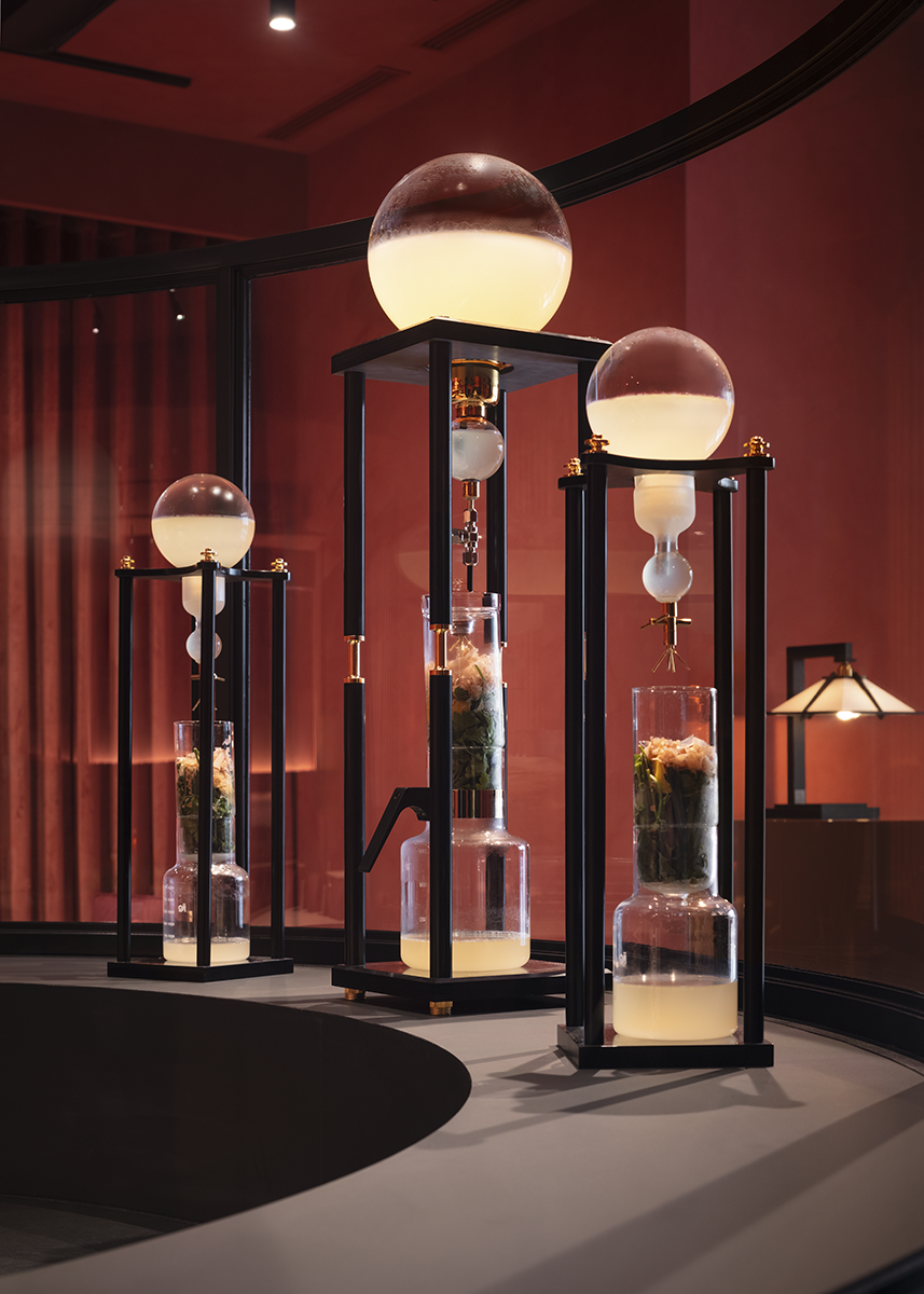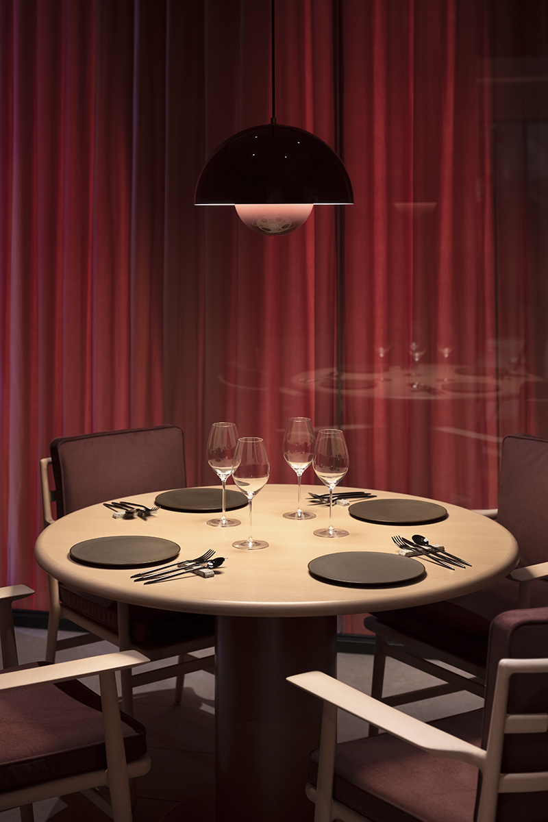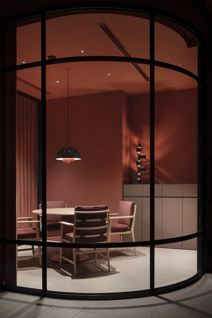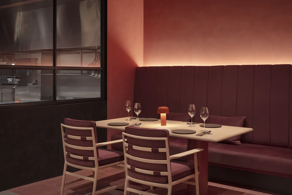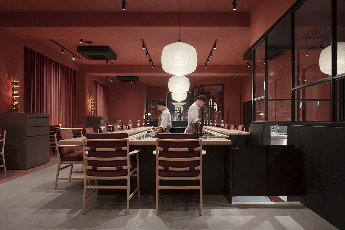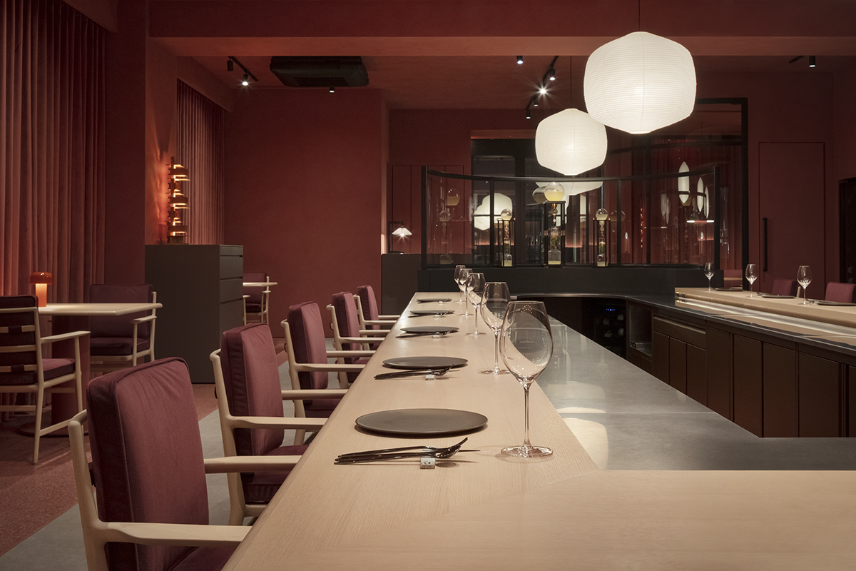 空間はピンクを基調としつつボルドーやブラウンで落ち着きを持たせ、水引のようなタッセルや提灯、