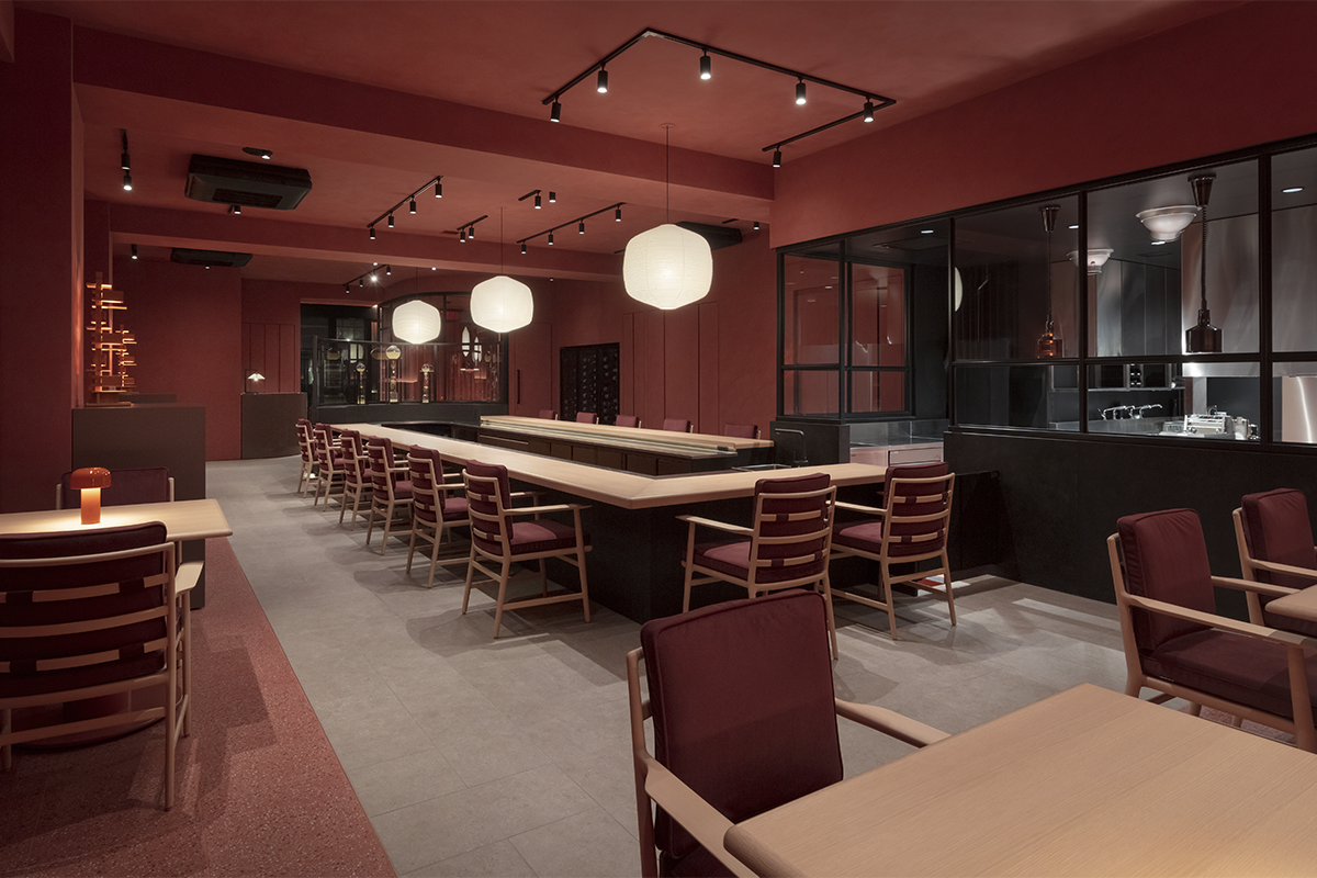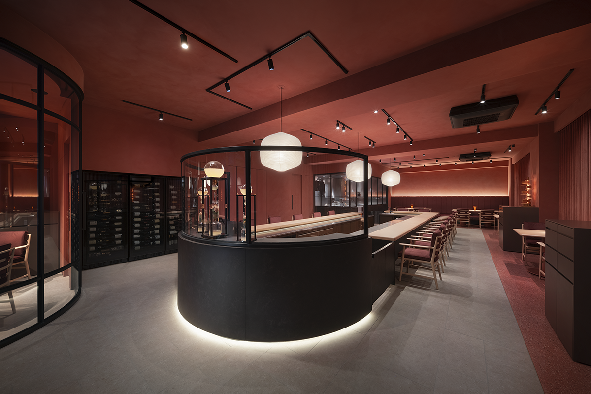 シェフと客席のコミュニケーションを活性化させるため、厨房面積を従来よりも拡張し、