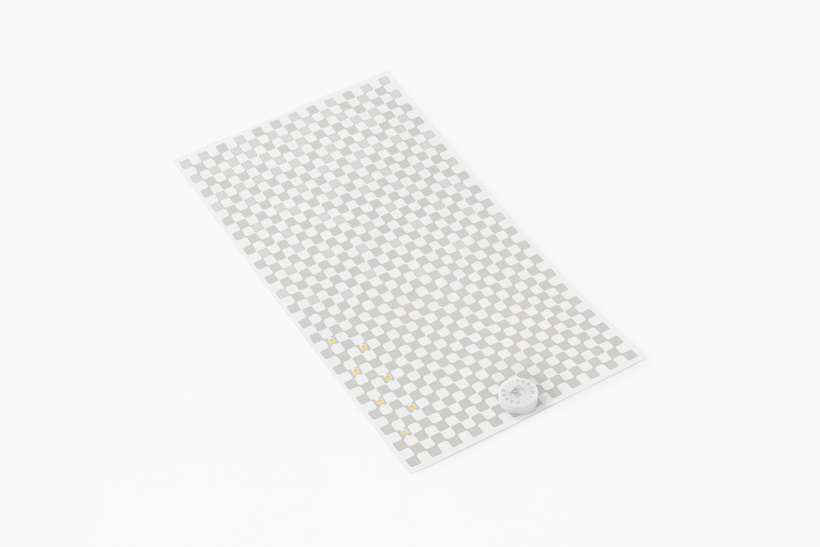 紙の両側にプリントする電子回路には、市松模様のデザイン処理を施し、ボタン電池2個とLED7個を
