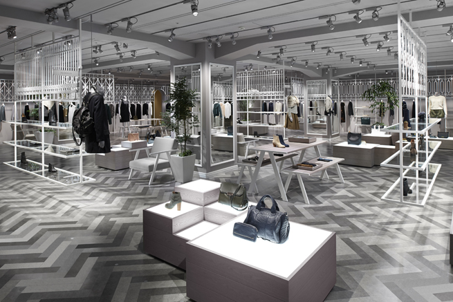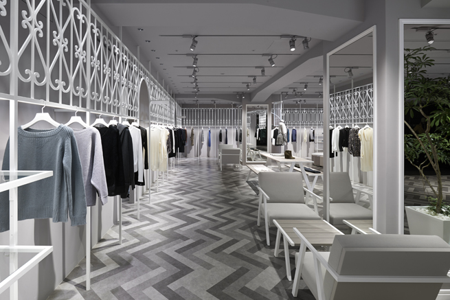 西武百貨店渋谷店の3階婦人服売場における、マルチブランド・エリア及び共用部分のデザイン。