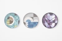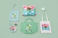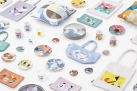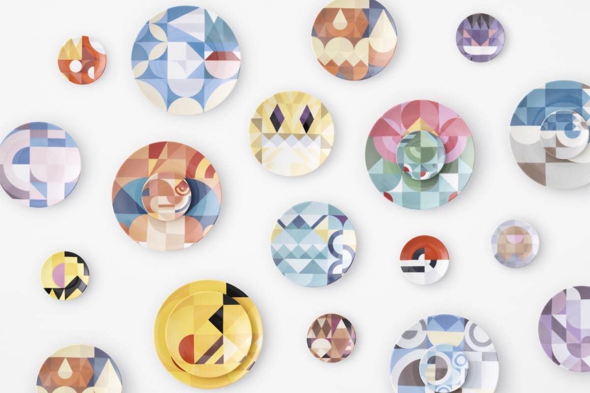 The 75-piece collection includes cushions, wall clocks, and bags, as well as tableware, such as glasses and plates.